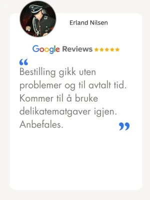 Enten mottakeren er i Oslo, Bergen eller en liten bygd, sikrer vi at din gave med mat kommer frem i tide og i perfekt stand over hele Norge. Med vår landsdekkende leveringstjeneste er det enkelt å sende en personlig oppmerksomhet til en du er glad i. Se våre vilkår og leveringstider her.