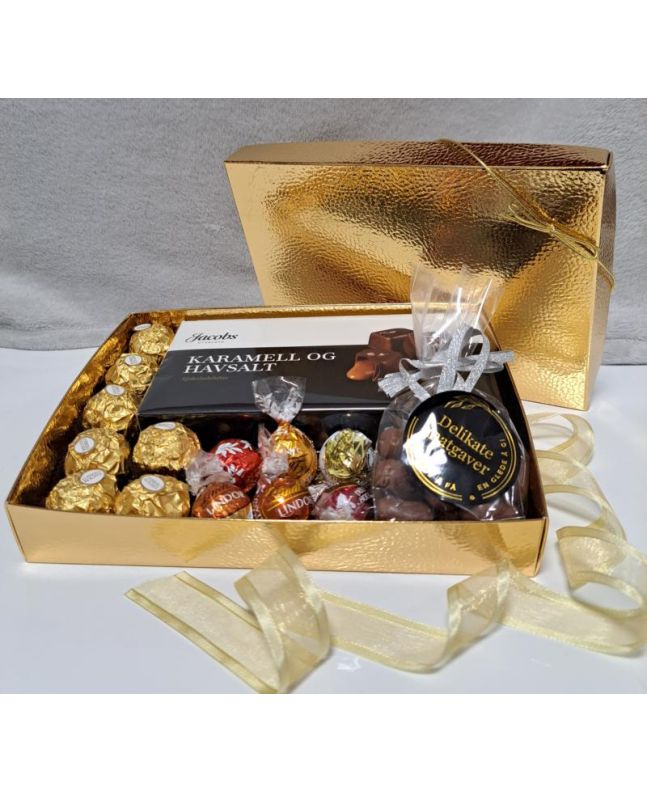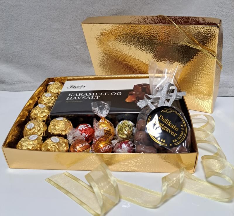 Denne elegante gaveesken er fylt med utsøkte sjokoladebiter Fererro Rocher, Lindt, Lakris og Karamell og Havsalt konfekt, perfekt for å imponere og glede mottakeren. Hver bit er en kombinasjon av kremet sjokolade og sprø nøtter, presentert i en elegant eske som gjør den til en ideell firmagave. Perfekt for å feire spesielle anledninger eller som en luksuriøs overraskelse.