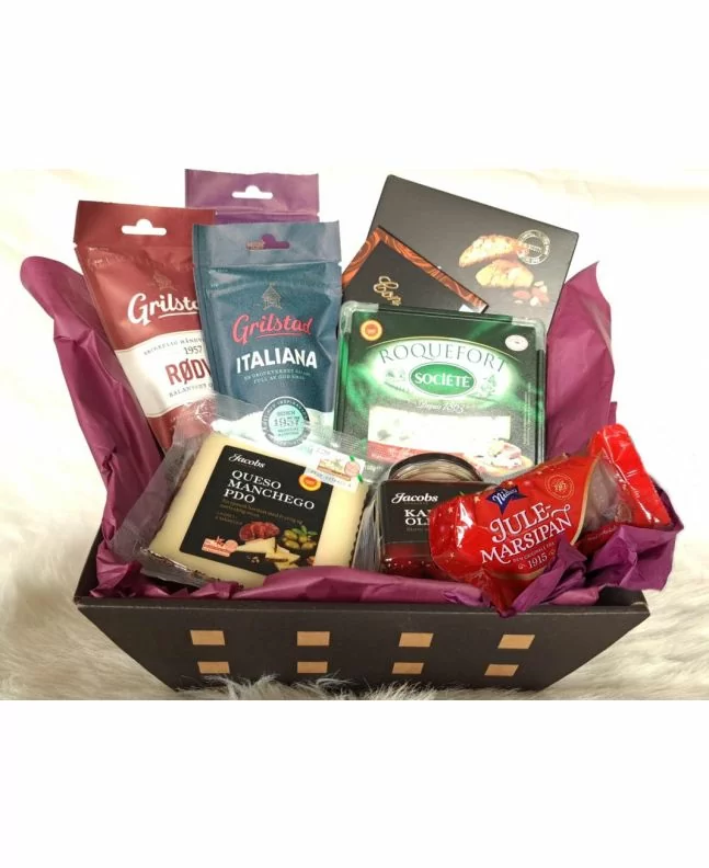 Start med de deilige olivenene fra Jacobs, som tilbyr en myk og fyldig smak. Nyt den aromatiske Manchegoosten samt den kraftige Roquefort fra SOCIETE, som gir en perfekt balanse av smak. La deg begeistre av Grilstads smakfulle rødvin, salchichon og italiensk skinke, sammen med sprø Cantuccini med mandler. Avrund måltidet med silkemyk mørk sjokolade og en sjarmerende marsipangris, perfekt for å skape glede blant familien.